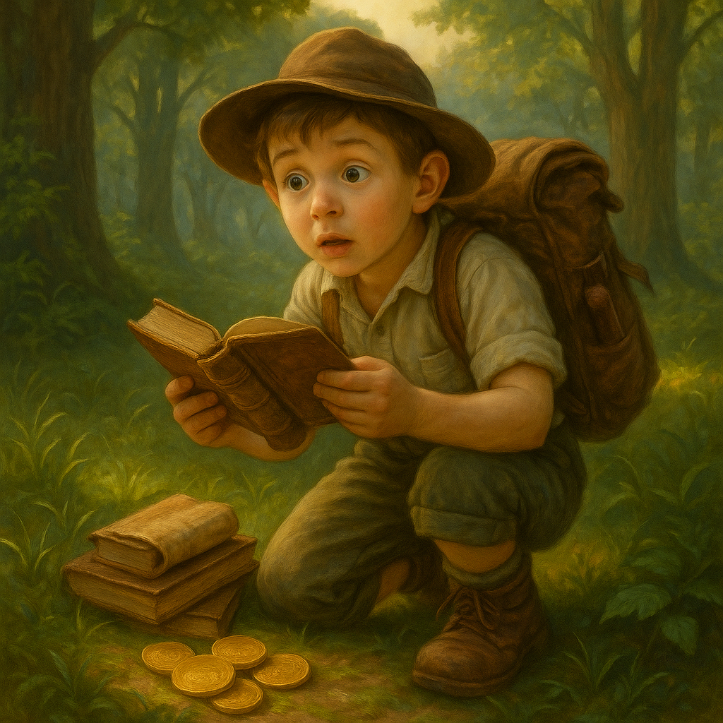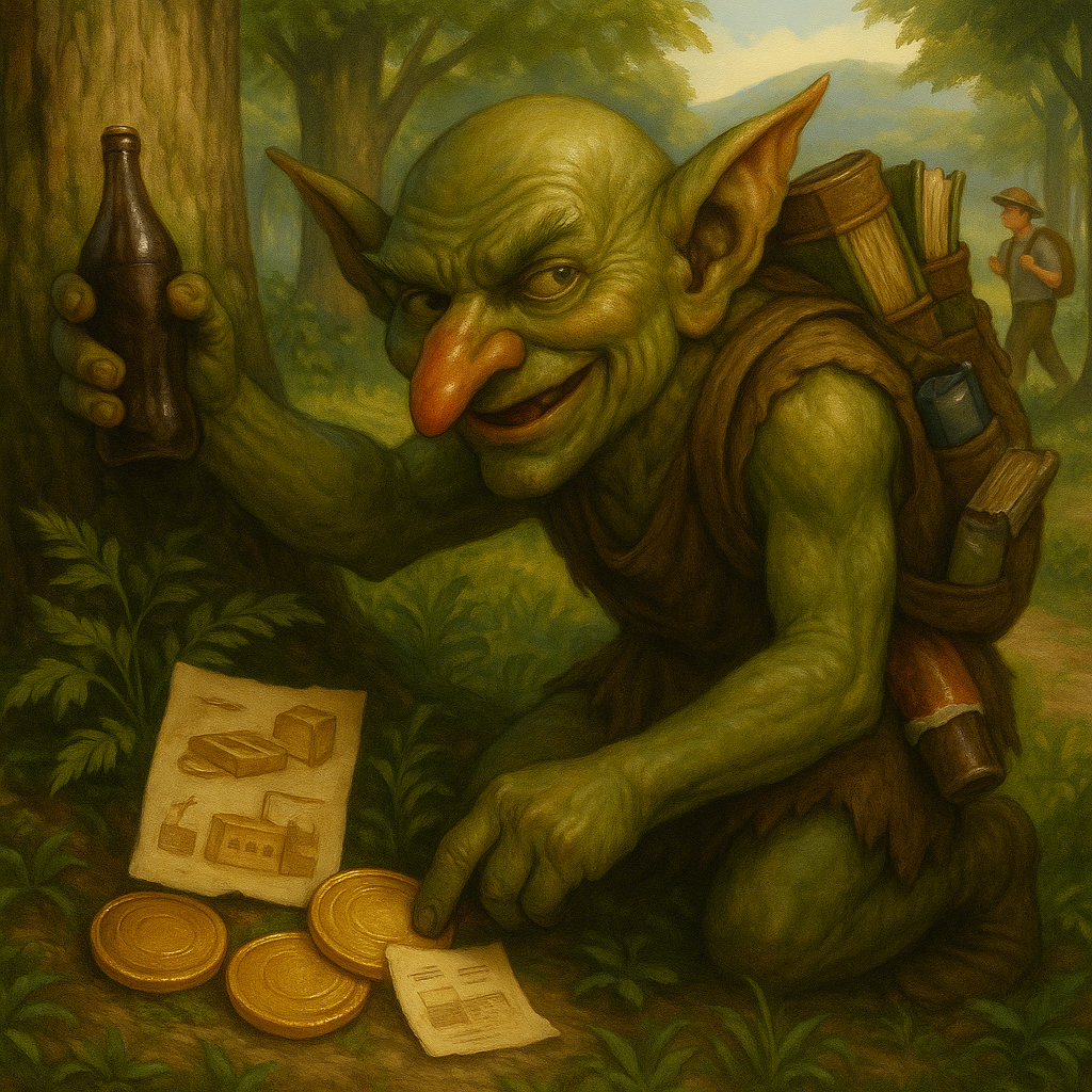 In the distance, you spot the goblin again—up to his usual mischief! He’s sneaking around, hiding more golden coins and slipping in little notes that explain how things are made. A half-eaten chocolate bar dangles from his pocket, and he’s clutching a fizzy soda in one hand. Books are practically spilling out of his overstuffed backpack as he shuffles from tree to tree, leaving behind clues for curious explorers like you. What is he planning this time?