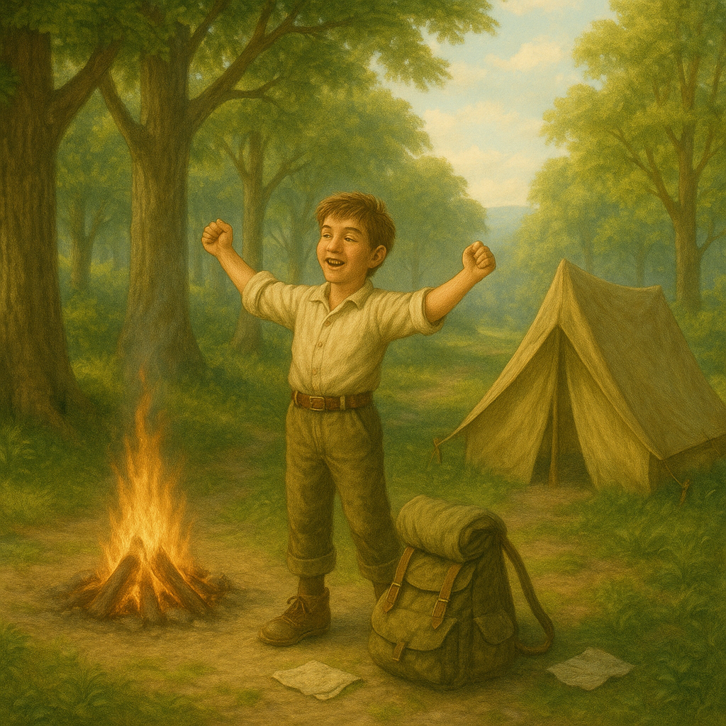 Morning light filters through the trees, casting a golden glow across the forest floor. You slowly wake, stretch your arms and legs, and take in the fresh, earthy scent of a brand-new day. After a big yawn and a smile, you start packing your bag, feeling energized and ready for another adventure.